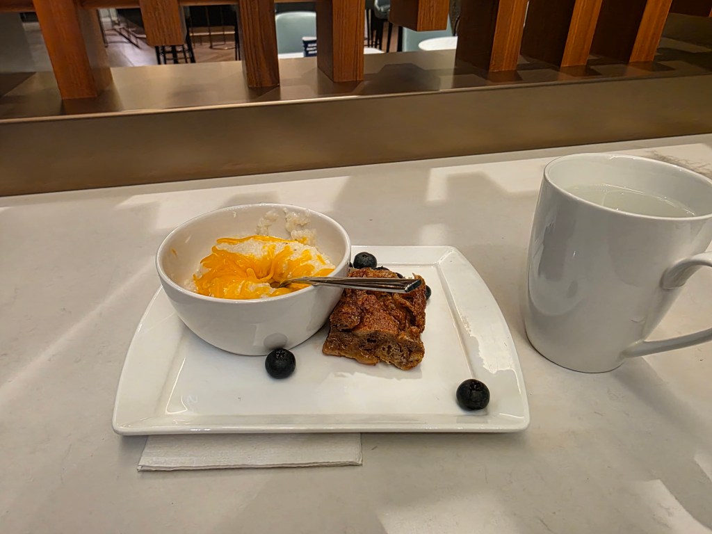 The presentation was clean and solid—exactly what you’d expect in a premium lounge setting. The grits hit the spot, and the water did what it needed to do before a cross-country flight.