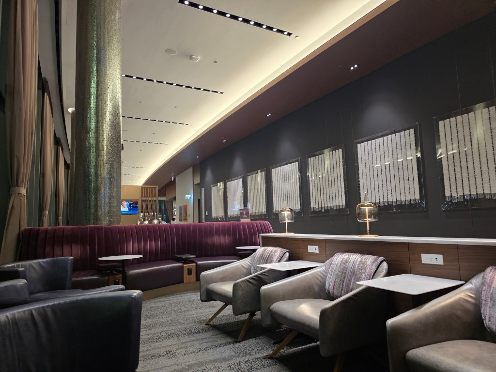 The design leans modern and upscale, with warm wood finishes, soft lighting, and a layout that feels more like a boutique hotel lobby than an airport lounge. The bar area, with its globe pendant lights and clean marble counter, immediately stood out—it’s the kind of place you could sit for a while even if you weren’t catching a flight.
