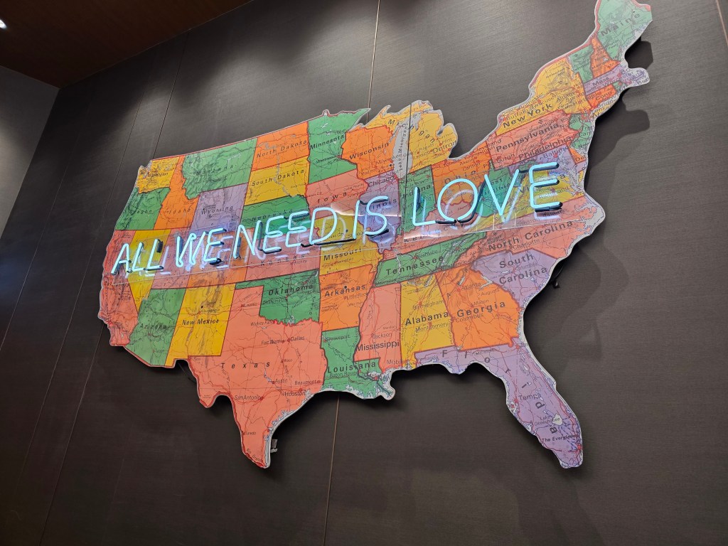 And then there’s the wall art—a large, colorful map of the United States with the phrase “All We Need Is Love.” It adds personality and gives the lounge a sense of place, rather than feeling generic.