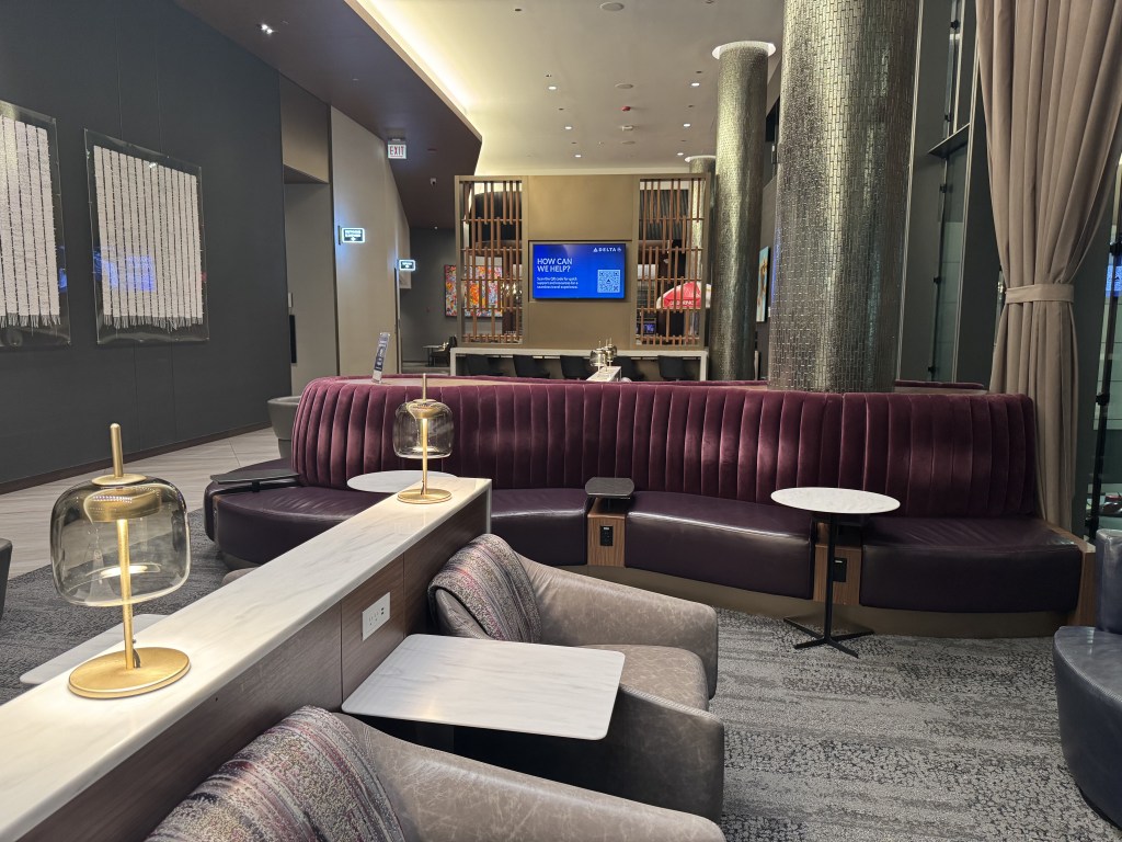 There are multiple seating zones throughout the lounge, from quiet, tucked-away chairs to more social, open areas. One section featured a curved, deep-purple couch with individual tables and charging ports—perfect if you actually plan to get work done.